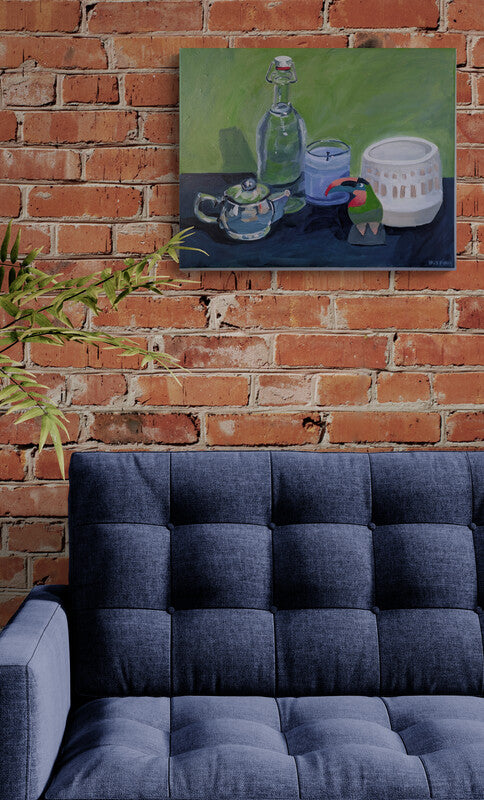 "Mr Toucan Steals the Show" features a little balsa wood toucan that I bought in Ecuador many moons ago when backpacking around South America. He is cheerful and always brightens up whichever spot I give him in my house. He seems to be admiring himself in the shiny teapot and is a happy character who always wants to see the best in everyone.